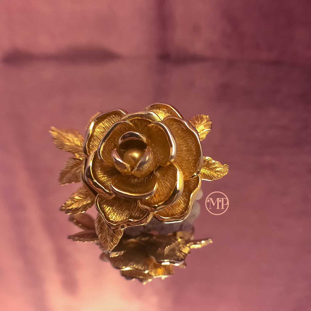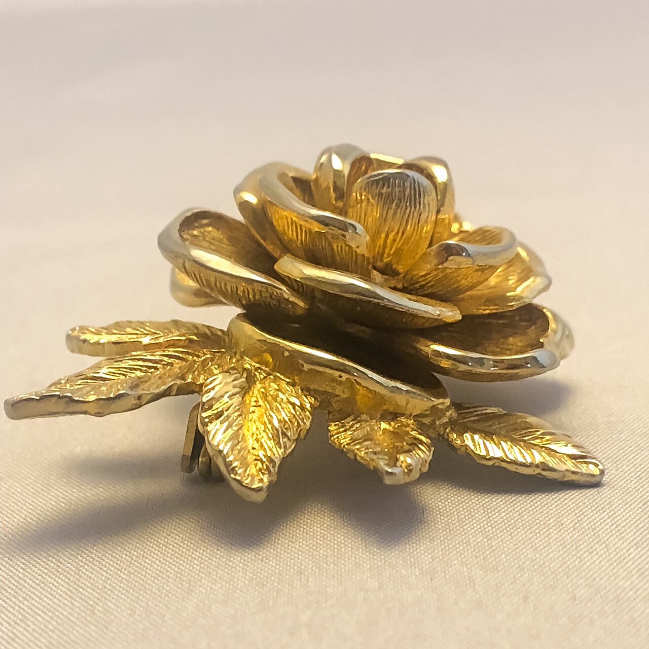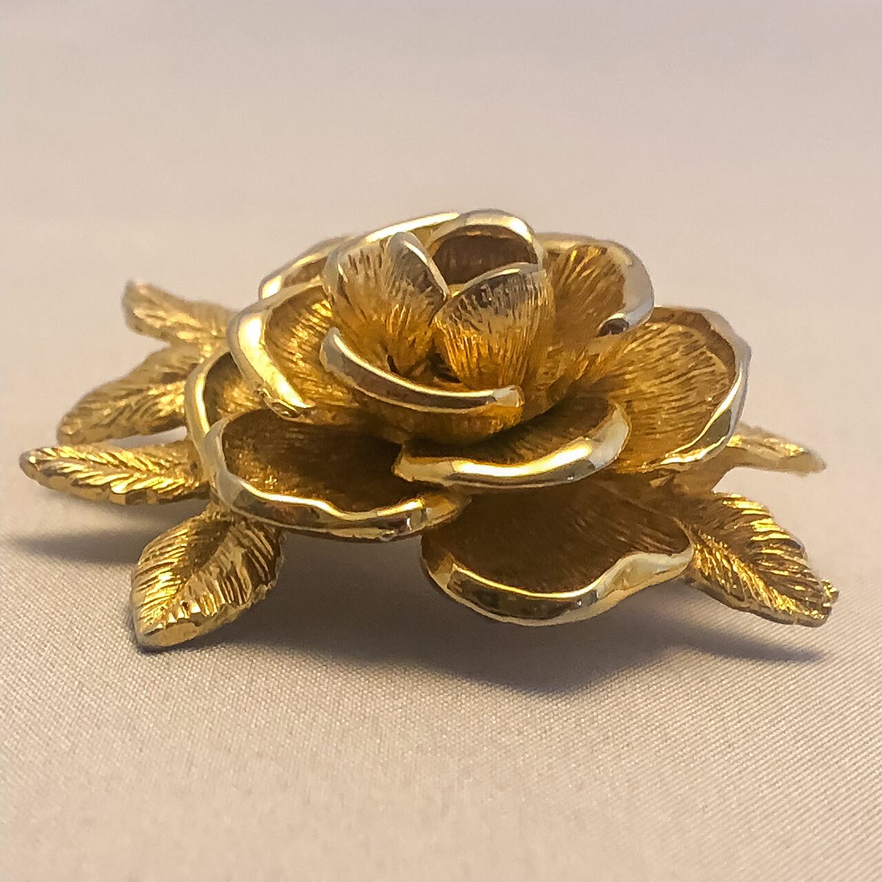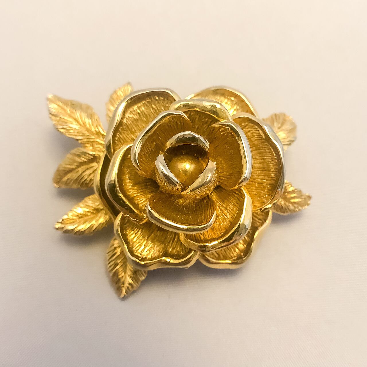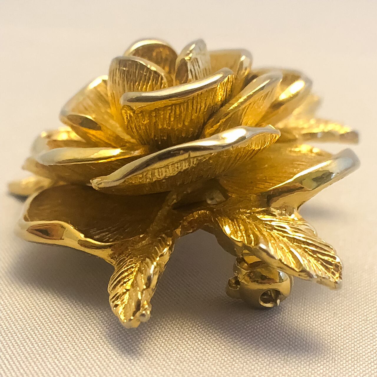 Sarah Coventryの小ぶりなバラのブローチになります。バラの花びらの縁の部分だけが艶があり、他の部分には艶を抑える為のテクスチャーが入っているのでより立体感を感じられ、小さいのに本物のバラのような複雑な奥行きがあります。