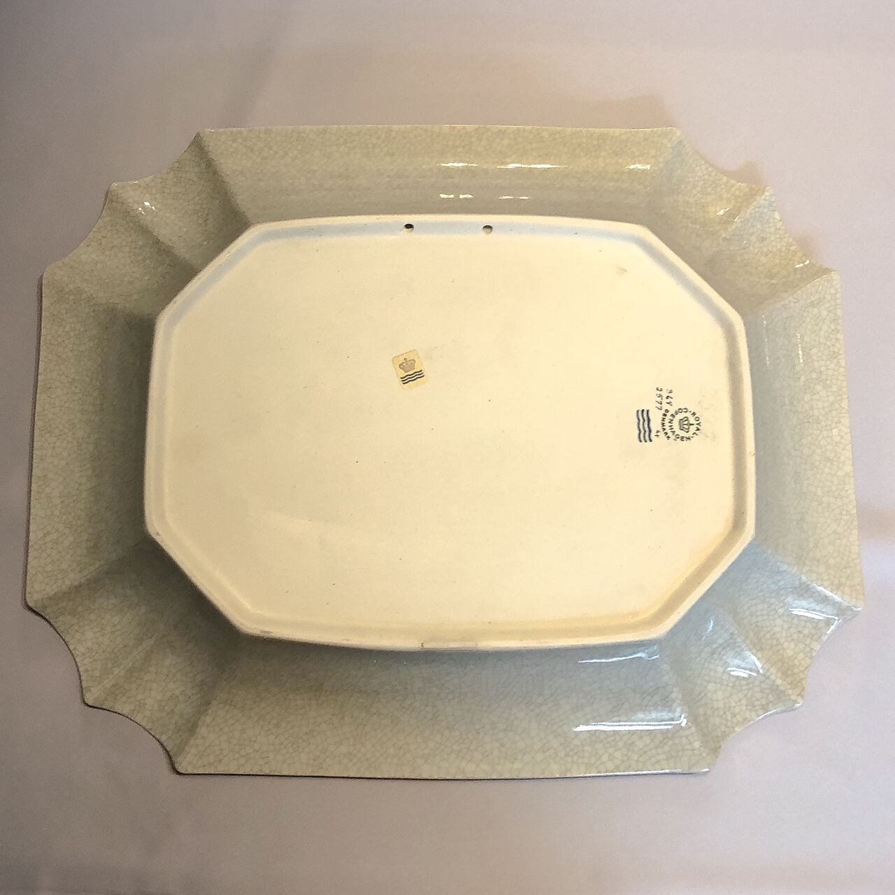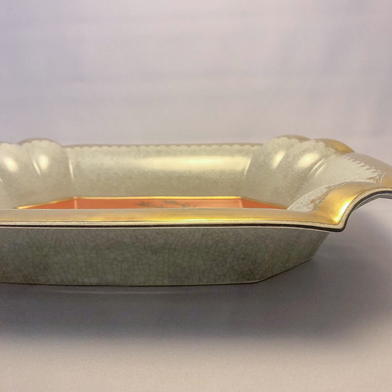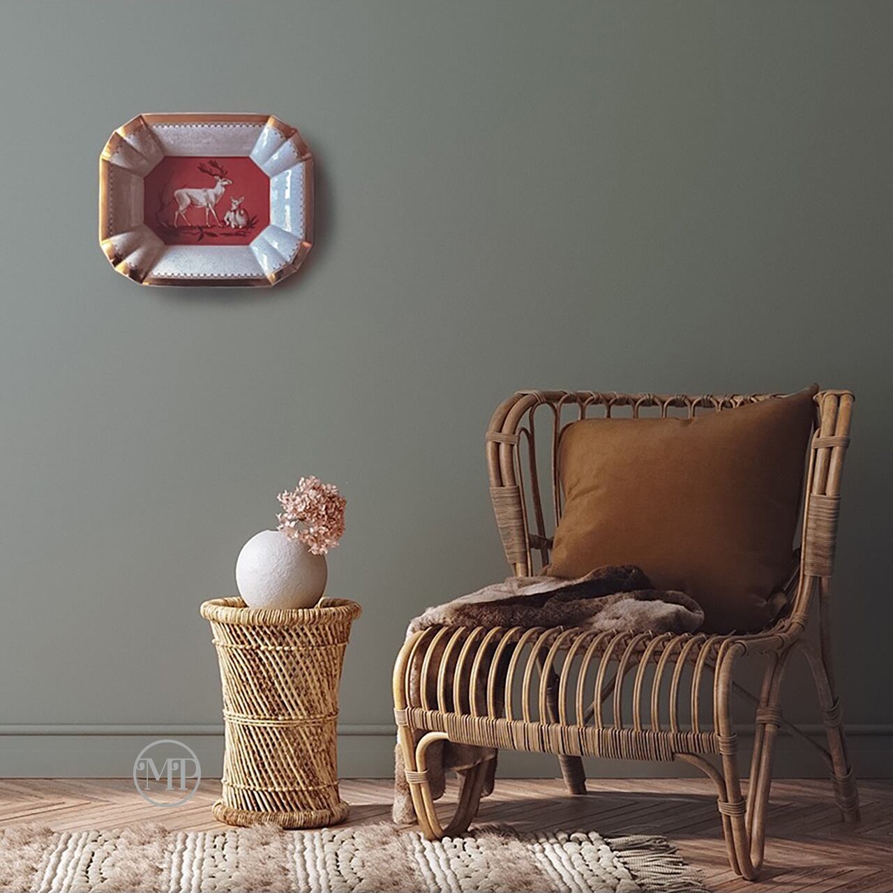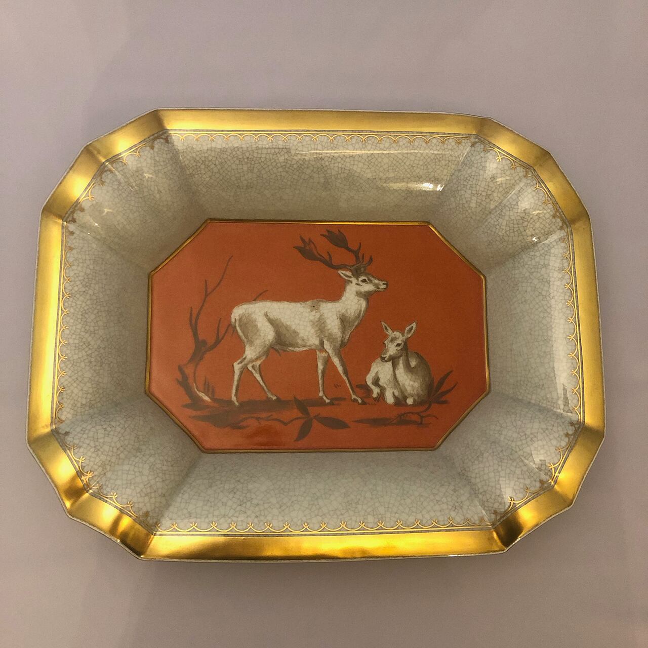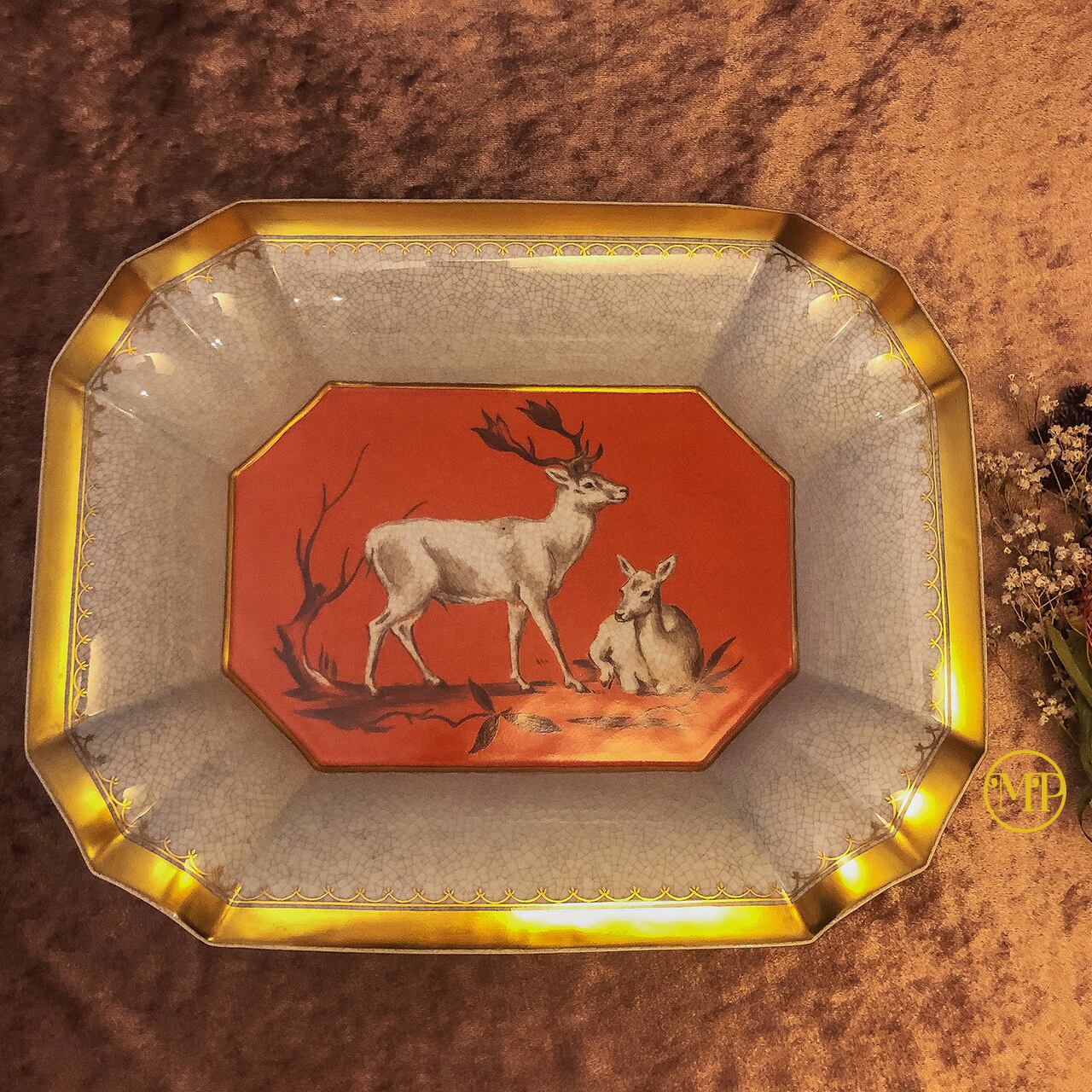 とてもレアな、ヴィンテージ のロイヤルコペンハーゲンの大変大きな深皿になります。Crackle Glazeと呼ばれている通り、お皿の全体に貫入が入っています。手描きで美しい雄鹿と雌鹿が描かれていて、なかなか他には無い個性的なデザインになっています。艶消しゴールドの縁が額縁のようでもあり、お皿自体もかなりの大きさと高さがあるので、額装された絵画のような存在感があります。実際に裏面には壁に飾る為のワイヤーを通す穴の2箇所あいているので、壁の絵画コレクションのひとつとして飾るととても素敵だと思います。