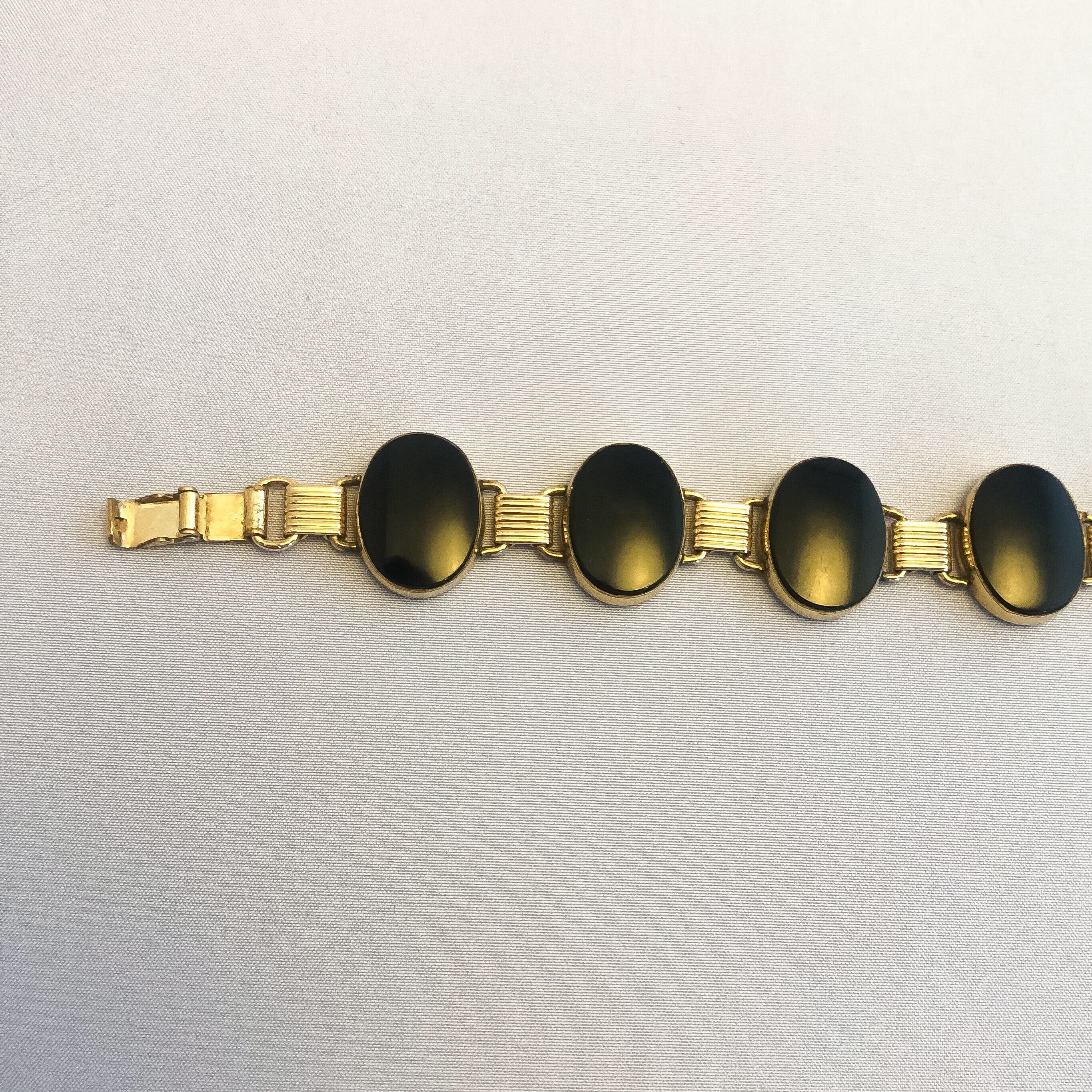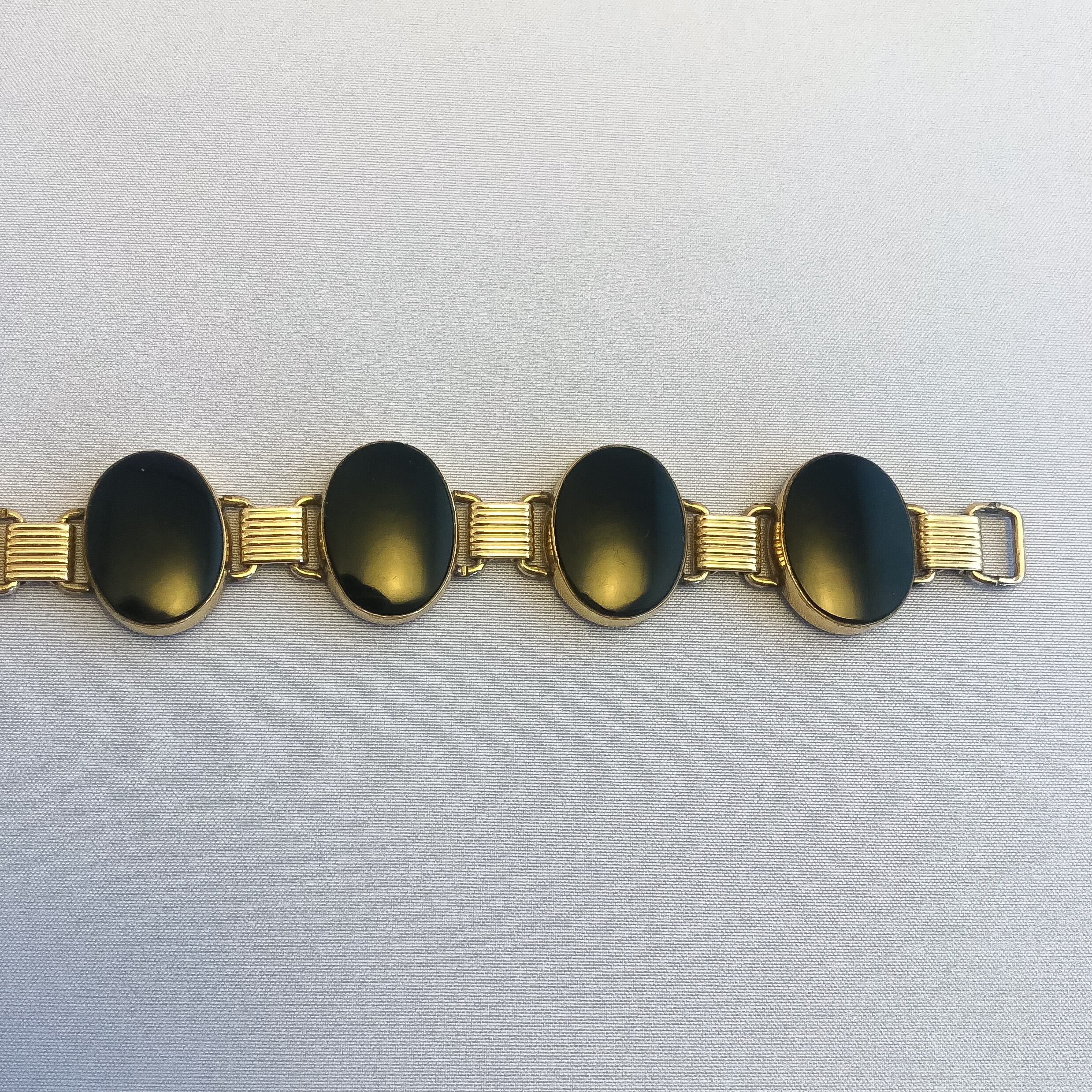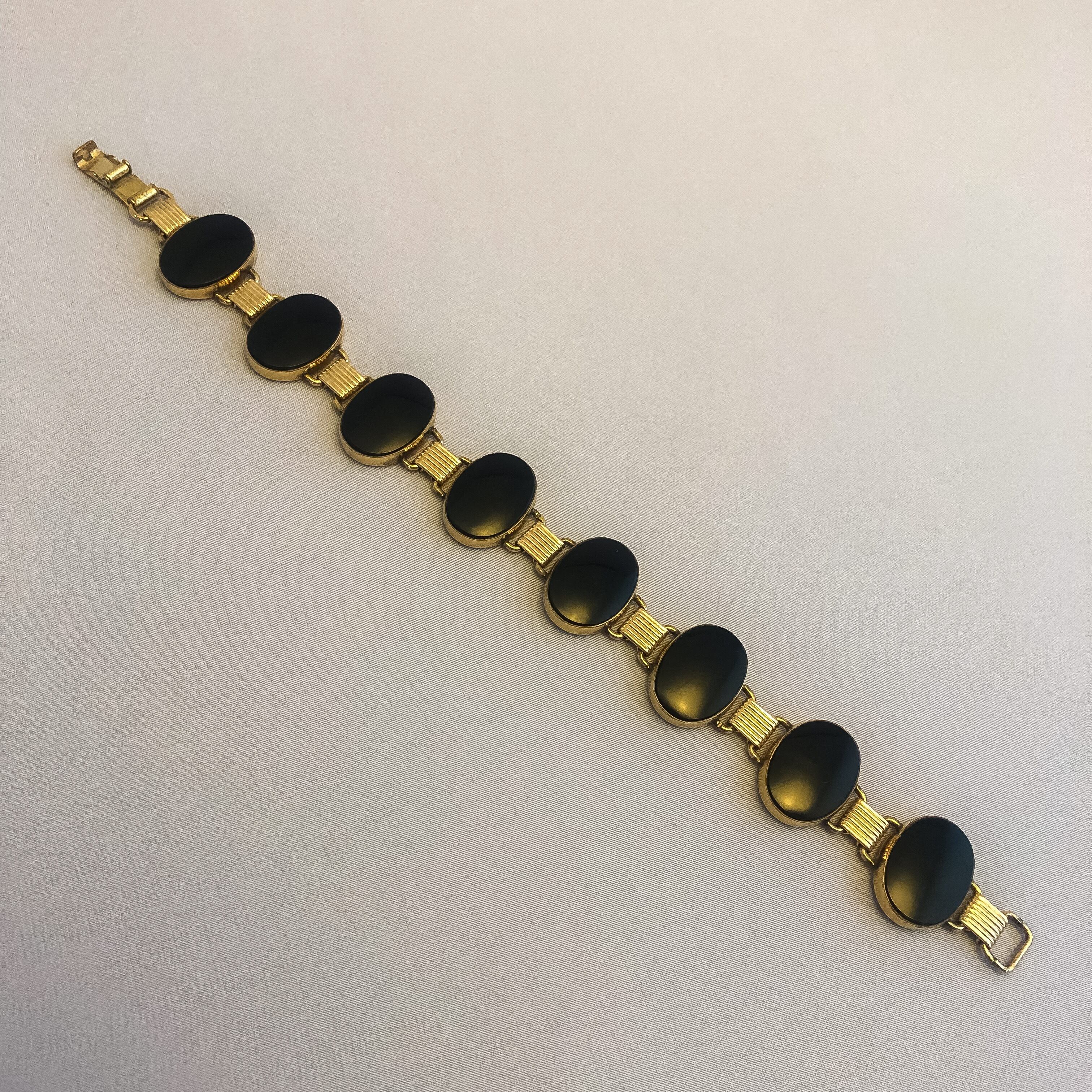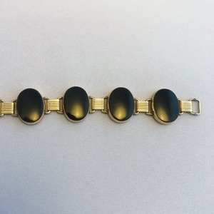 W. E. Richardsの8個の本物のオニキスを使用したアール・デコを思わせるクラシカルなデザインのブレスレットになります。1/20 12K GFの刻印があるので、メタルの部分は12金の重量が素材総重量の1/20以上(5%以上)の金張り(通常の金メッキよりも金の層が厚いもの)となっています。経年によりヴィンテージならではの落ち着いたゴールドトーンになっていて、派手になりすぎず上品な風合いとなっています。クラシカルな装いからマニッシュなジャケットやカジュアルまで、何にでも合う色とデザインなのでとても使いやすく重宝するアイテムになると思われます。