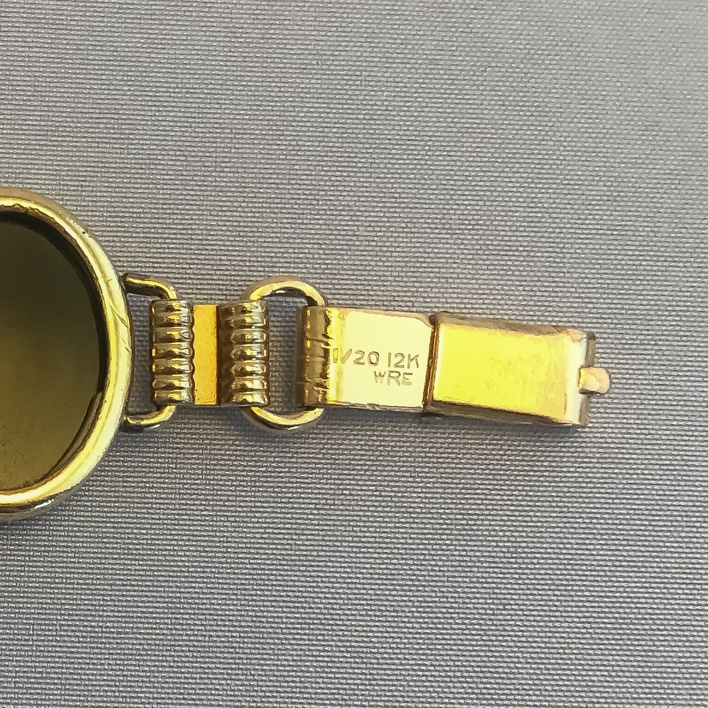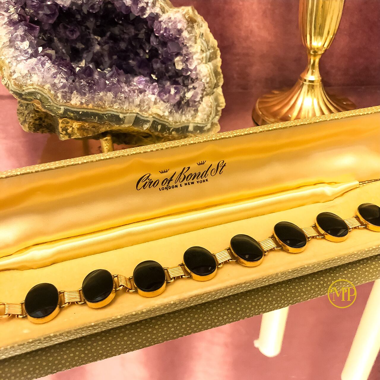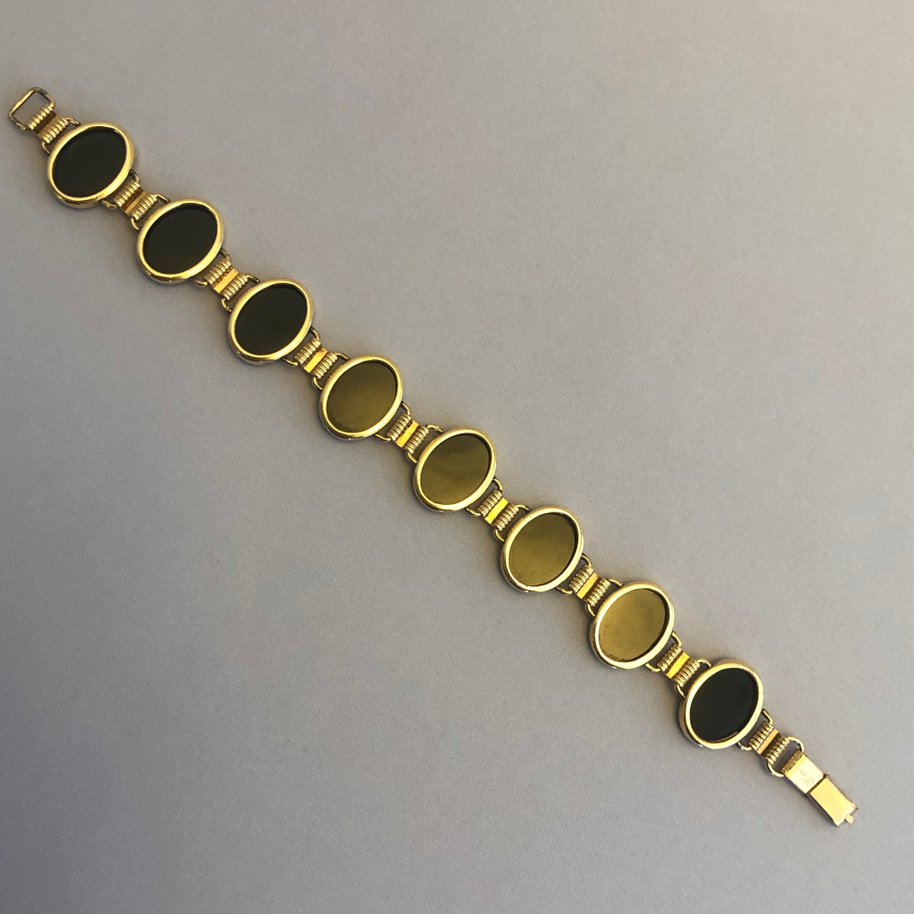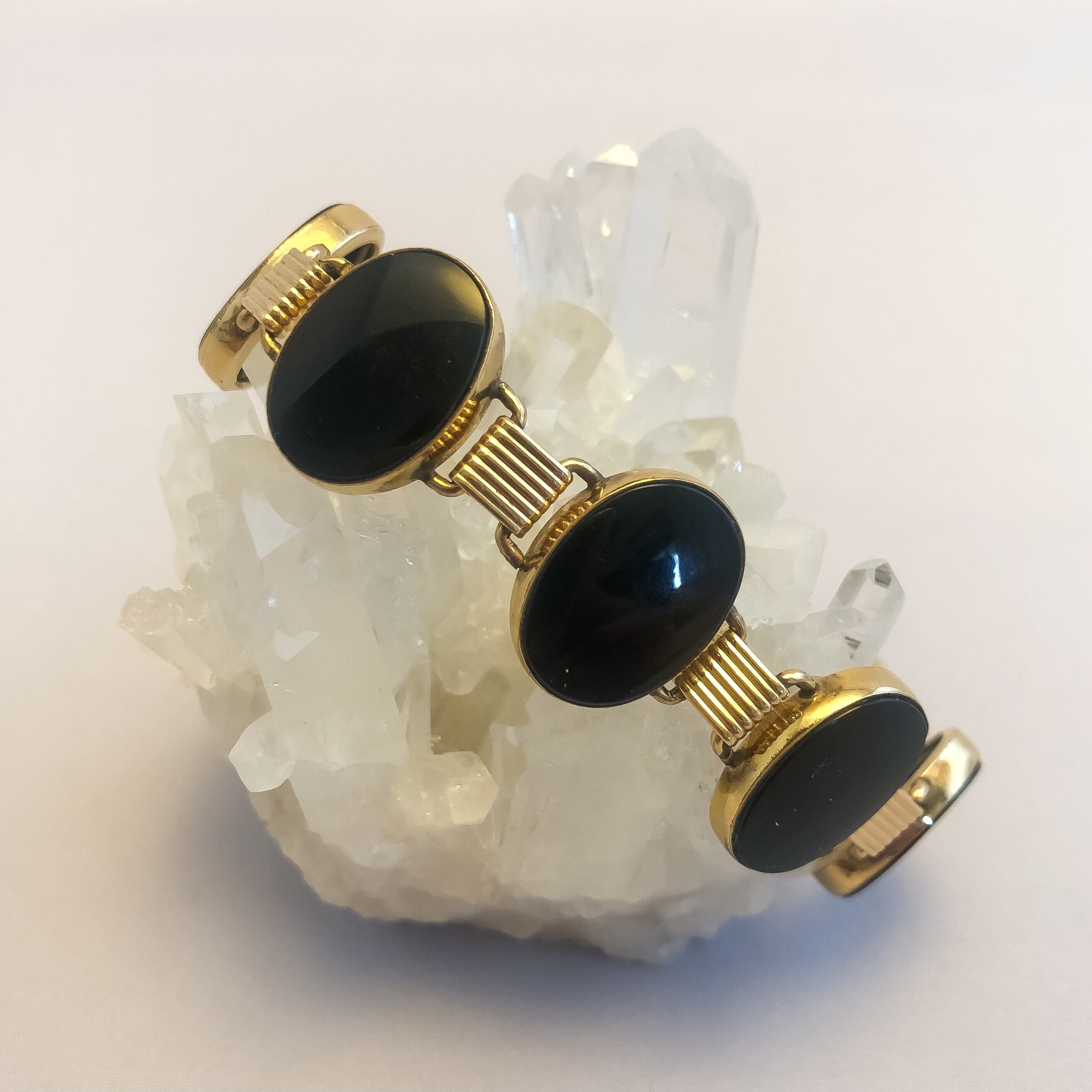 W. E. Richardsの8個の本物のオニキスを使用したアール・デコを思わせるクラシカルなデザインのブレスレットになります。1/20 12K GFの刻印があるので、メタルの部分は12金の重量が素材総重量の1/20以上(5%以上)の金張り(通常の金メッキよりも金の層が厚いもの)となっています。経年によりヴィンテージならではの落ち着いたゴールドトーンになっていて、派手になりすぎず上品な風合いとなっています。クラシカルな装いからマニッシュなジャケットやカジュアルまで、何にでも合う色とデザインなのでとても使いやすく重宝するアイテムになると思われます。