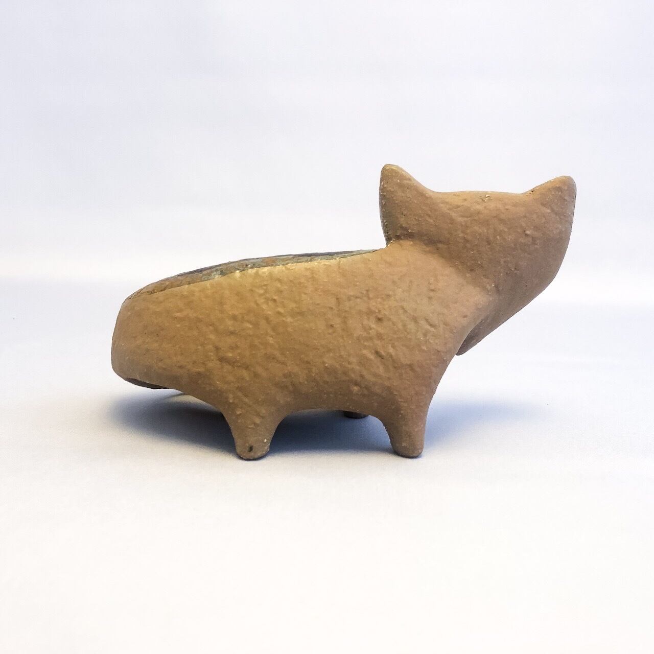 スウェーデン GUSTAVSGERG社にてリサ・ラーソンがデザインをした"Lilla Zoo(小さな動物園)"シリーズのキツネのヴィンテージのフィギュリンになります。リサ・ラーソンが20代の頃にデザインしたもので、彼女の長いアーティスト活動のなかでは初期の作品になります。立体的でありながら、平面的な感じもして不思議な美しさがあります。表情もなんとも言えない素朴な愛らしさがあり、後ろ姿も愛おしくなるフォルムで、日に日に愛着が湧いてしまいそうな作品です。出荷時のシールも底に綺麗な状態でついて、全体的にとても状態が良いです。