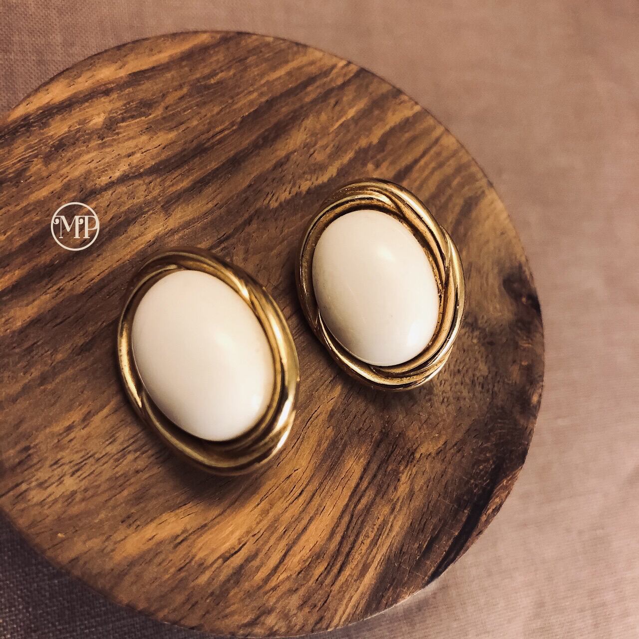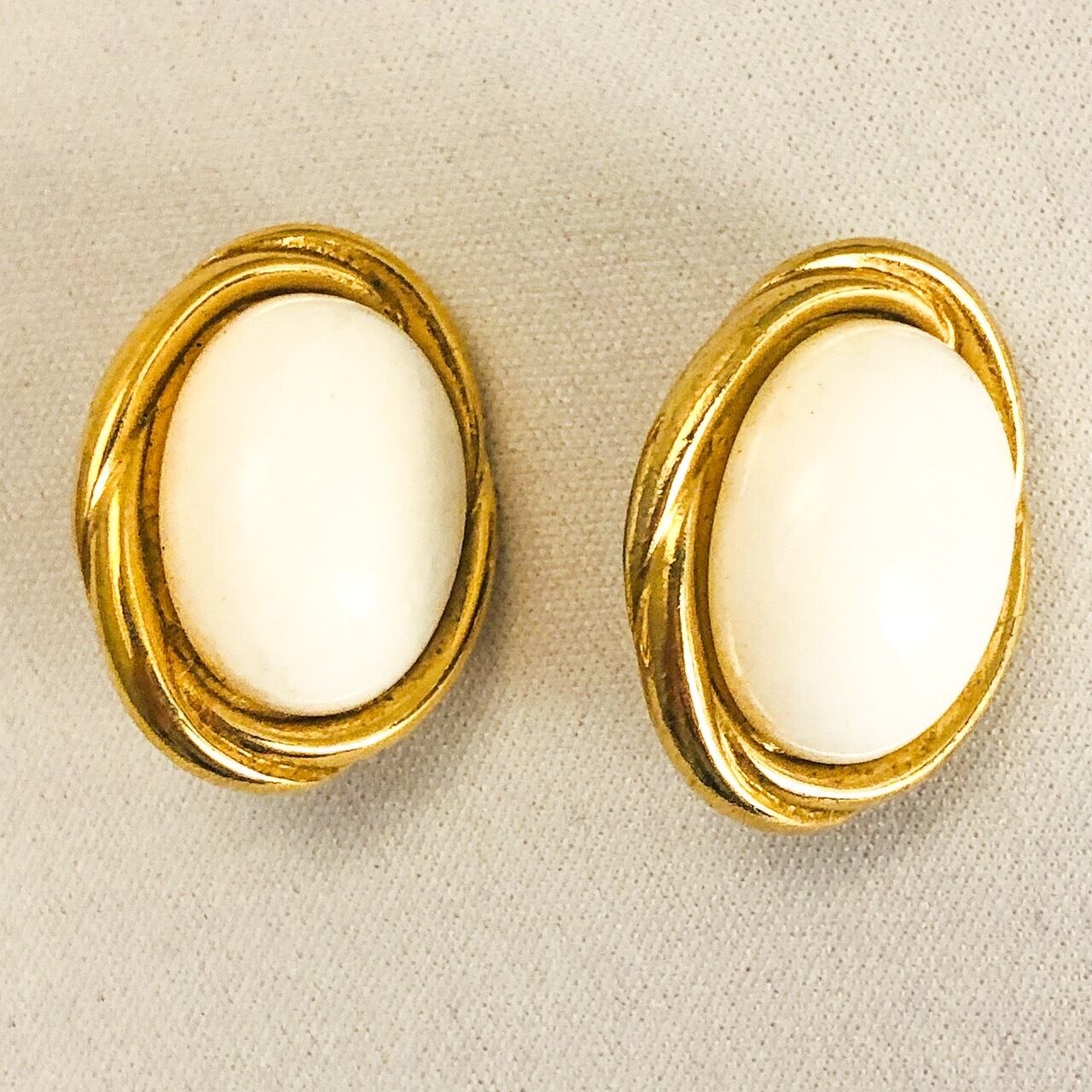 温かみのある白いカボションが印象的なCrown Trifariのイヤリングになります。枠のゴールドの部分には少し装飾があるのでシンプルになりすぎず上品なデザインです。