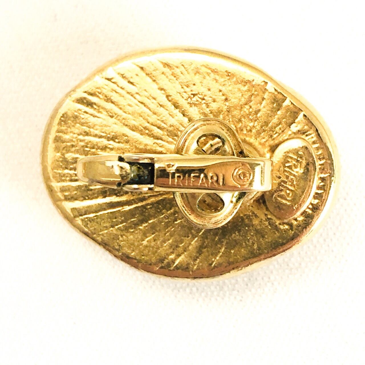 グスタフ・トリファリは祖父からジュエリービジネスを学び、1904年にイタリアからアメリカ ニューヨークに移民しました。1910年にトリファリ社を設立。1930年〜1968年はカルティエやヴァンクリーフ&アーペルでデザインをしていたフランス人のアルフレッド・フィリップがチーフデザイナーに就任し、ジェリーベリーと呼ばれるクリスタルやムーンストーンのようなストーンを使った作品や、フルーツサラダと呼ばれるどんぐりのような形のストーンを使った作品など素晴らしいジュエリーをを残しています。トリファリのジュエリーに使われているメッキは TRIFARIUMと呼ばれ高い評価を得ていて滅多なことでは剥げないうえ、時を得ても適切なクリーニングで輝き続けます。